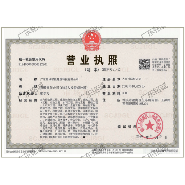 廣東銘誠智能建筑科技有限公司成立于2008年,公司注冊資金為6000萬元,集辦公裝修、酒店裝修、家庭裝修、軟裝裝飾、娛樂場所裝修為一體的裝飾公司,率先提出“創造現代人文空間,挑戰業界高峰”的雄壯口號,并以此為目標,完成了一大批具有影響力的大型公裝工程:其中包括廣州國際中醫藥展貿中心、奧飛澄海音樂廳、澄海區國家稅務局、澄海興信小額貸款、澄海潮商村鎮銀行、汕頭龍湖賓館、澄海豪庭大酒店、御園國際飲食城、澄海福晉軒酒家、享樂匯保健有限公司、假日商務酒店、尚景康園物業、星輝車模股份有限公司、奧飛動漫有限公司、香港國際玩具、汕頭萬基貿易有限公司、泰興源實業有限公司、汕頭皇冠玩具有限公司等;家裝工程包括南澳黃金海岸整幢的精裝房、中信華府、富春華庭、金信鳳凰名城、凱旋花園、中信金城、柏嘉半島、陽光海岸、金葉島等高等住宅。 ? 廣東銘誠智能建筑科技有限公司經過十余年的建筑裝飾裝修施工領域項目積淀,于2018年2月取得“建筑裝修裝飾工程專業承包二級”、“建筑機電安裝工程專業承包三級”、“建筑工程施工總承包三級”、“施工勞務不分等級”、“安全生產許可證”等專業資質,并于2021年8月建筑裝修資質正式升級為“建筑裝修裝飾工程專業承包一級”。這是對企業規模、工程業績、管理水平、誠信表現的肯定,是企業實力與能力的展現。 ? 公司每一項工程都始終堅持“精美設計、精心施工、確保合同承諾;勤奮開拓、追求突出、創造時代精品”的質量方針,力爭做一項工程,樹一座豐碑。 ? ?銘誠擁有一支由專業的營銷精英和客戶顧問組成的營銷隊伍,勤奮、敬業的每一位銘誠員工將本著“贏在別人休息時”的專業精神,為客戶提供全程營銷及售后服務,確??蛻舻暮戏ɡ妫峁w貼周到的服務,做到讓顧客滿意。 ? 銘誠擁有一批資老牌室內環境設計師,以“現代人文空間”為設計理念,為客戶提供人性化、差異化、智能化的室內環境設計服務,準確的將人性化特點與室內環境相融合,達到了“現代人文空間”的和諧統一。 ? ? ? ?自主創新、視社會責任為己任的精神使我們在發展的道路上屢獲殊榮:不斷提升的銘誠品牌知名度和美譽度,靠的是優質的產品,靠的是不斷提升的營業績,靠的是國內的核心技術和誠信的服務。相信通過銘誠人的努力,銘誠將會不斷以新的姿態為提升廣大消費者的生活質量做好服務,為中國裝飾行業設計創新做出突出貢獻。 ? ? “忘掉競爭、共